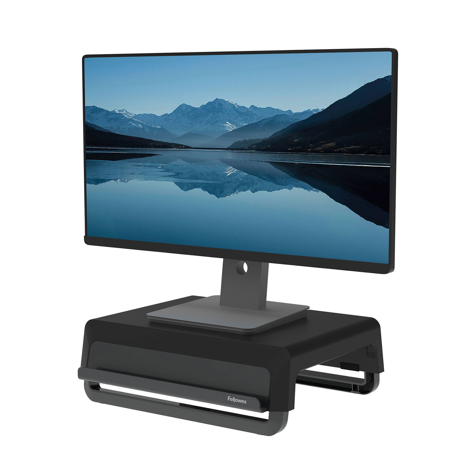Soporte monitor con 3 ajustes de altura para comodidad de visualización ergonómica. Diseño compacto, liviano y portátil que es fácil de configurar, ajustar, y almacenar ideal para trabajos híbridos. Estética de diseño moderno y simple disponible en opciones de color blanco y negro. Soporte frontal para dispositivos como móviles y tablets. Fabricado con materiales que son 100 % reciclables y duraderos con una garantía extendida de 5 años. Soporta pantallas de hasta 15 kg de peso.