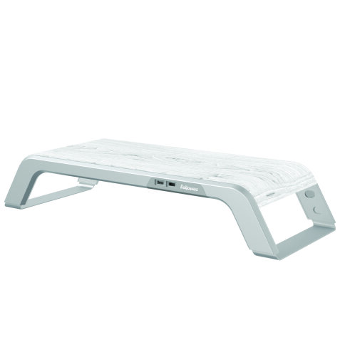Maximiza el espacio del escritorio y eleva el monitor a una altura de visualización cómoda para reducir la tensión en los ojos, el cuello y los hombros. 3 ajustes de altura para lograr la visualización correcta. Equipado con 4 puertos USB para mantener los dispositivos alimentados: 2 USB 2.0 (Tipo A) y 2 puertos de carga rápida 2.1A (Tipo A). Diseño elegante con base de aluminio y acabado en madera, disponible en blanco o negro.