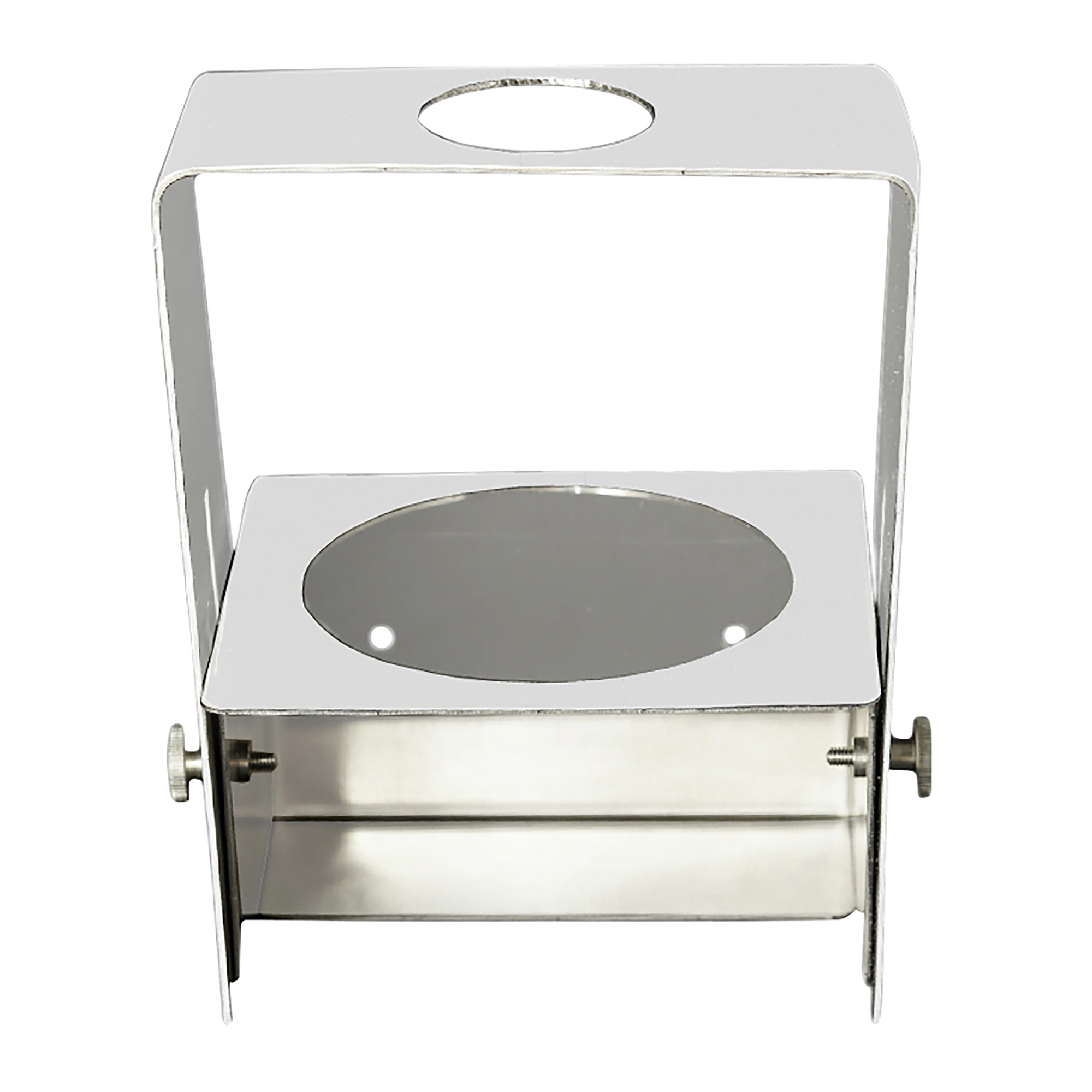 Soporte sencillo de pared metálico color blanco. Dimensiones: altura 16cm x ancho 15cm x fondo 15cm. Dispone de una bandeja para colocar un dosificador de gel hidroalcohólico o desinfectante. No incluye el bote de gel.