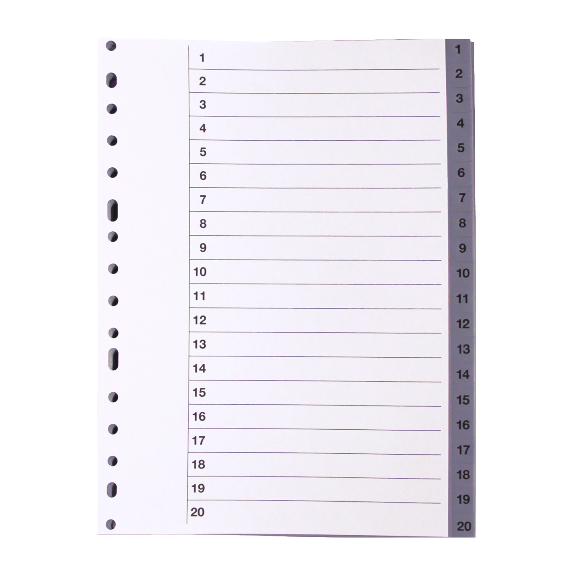 Descripción detalladaSeparadores A4 en polipropileno de 125 micras.Taladro con 16 perforaciones.20 divisiones del 1 al 20. Color gris.