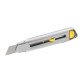 Cuerpo metálico muy resistente. Forma anatómica antideslizante. Botón de empuje y bloqueo eficaz de la hoja mediante rueda con muesca. Disponible en hoja de 9,5 y 18 mm.
