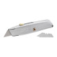 Descripción detalladaCuchillo de hoja retráctil con cuerpo de zinc pintado de gris. El diseño de su parte superior mantiene segura la hoja en su posición. Resorte adicional interno de acero. Suministrado con 5 hojas en su interior.
