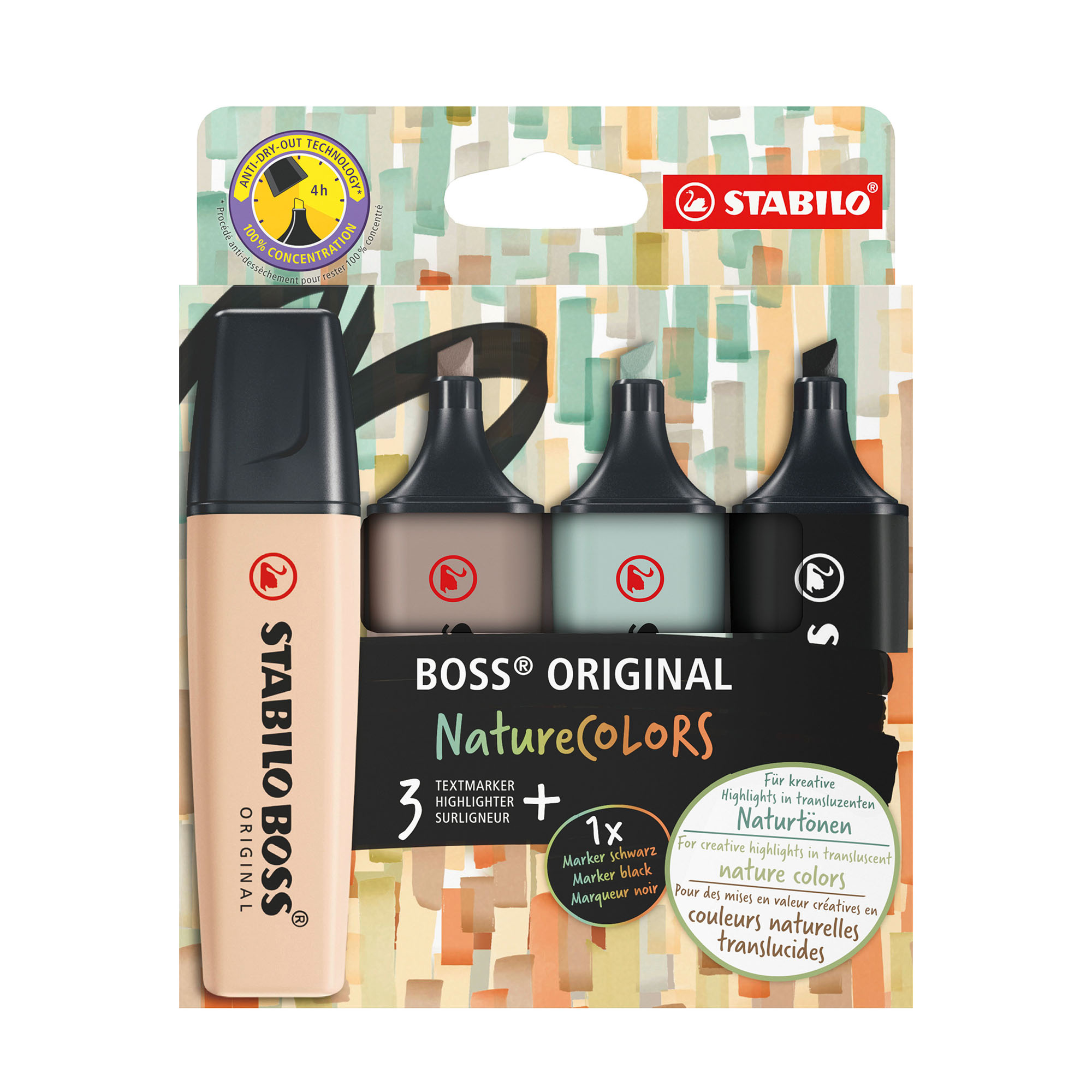 Fabricado en Alemania, STABILO BOSS ORIGINAL NatureCOLORS puede dejarse abierto hasta 4 horas sin secarse.