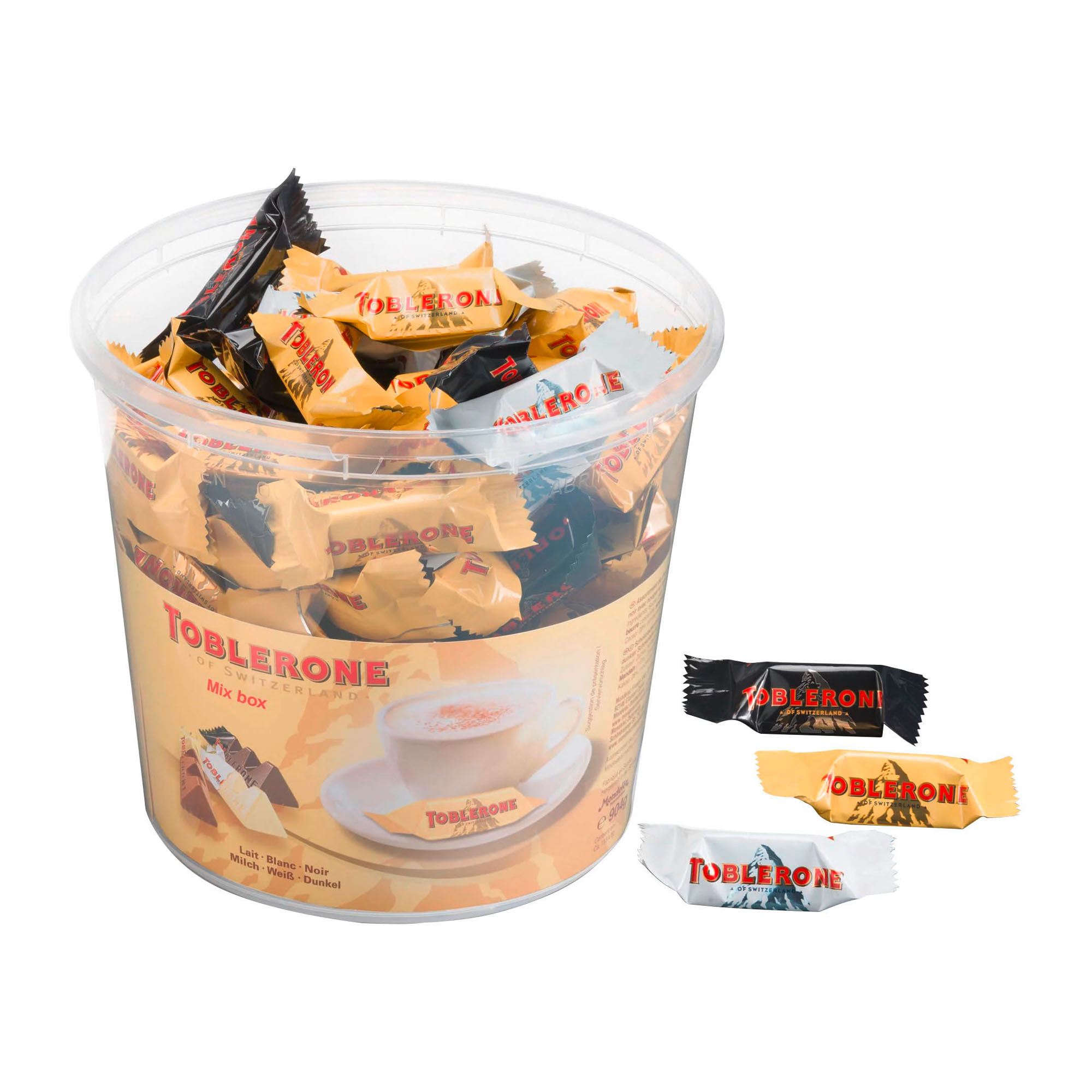 Surtido de chocolatinas de chocolates suizos: con leche, chocolate blanco y chocolate negro. Elaborados principalmente con leche suiza y nougat de miel con almendras caramelizadas, para una combinación exquisita de texturas y sabores.