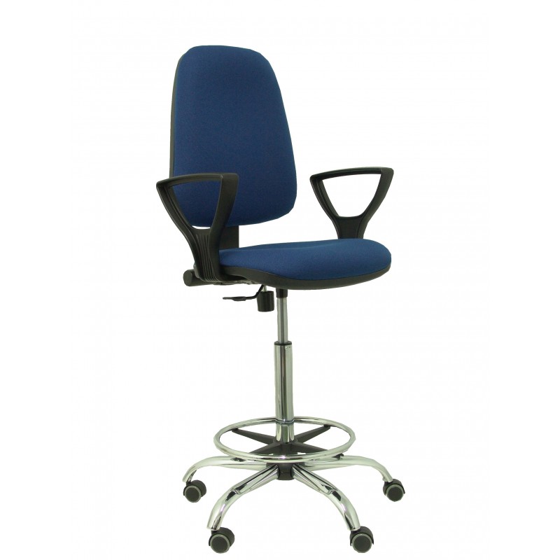 Regulable en altura mediante cilindro de gas cromado. Mecanismo de contacto permanente y regulación del respaldo en altura, profundidad e inclinación Asiento y respaldo tapizados en tejido BALI color azul marino Base cromada de alta resistencia de 5 radios y 60 cm de diámetro Giratoria 360º, gas cromado, ruedas de parquet, aro reposapiés cromado y brazos fijos incluidos