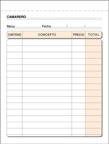 Talonario de camarero vertical. Transcripción sin carbón. Papel 60 g. Formato 105 x 150 mm natural. 3 copias Castellano (50 hojas blancas, 50 amarillas, 50 rosas).