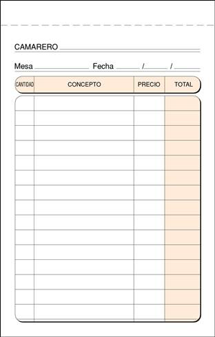 Descripción detalladaTalonario de camarero vertical. Transcripción sin carbón. Papel 60 g. Formato 90 x 140 mm natural. 3 copias Castellano (50 hojas blancas, 50 amarillas, 50 rosas).