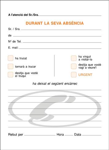 Descripción detalladaTalonario de llamadas vertical. Transcripción sin carbón. Papel 60 g. Formato 105 x 150 mm natural. 1 copia Catalán (100 hojas blancas).
