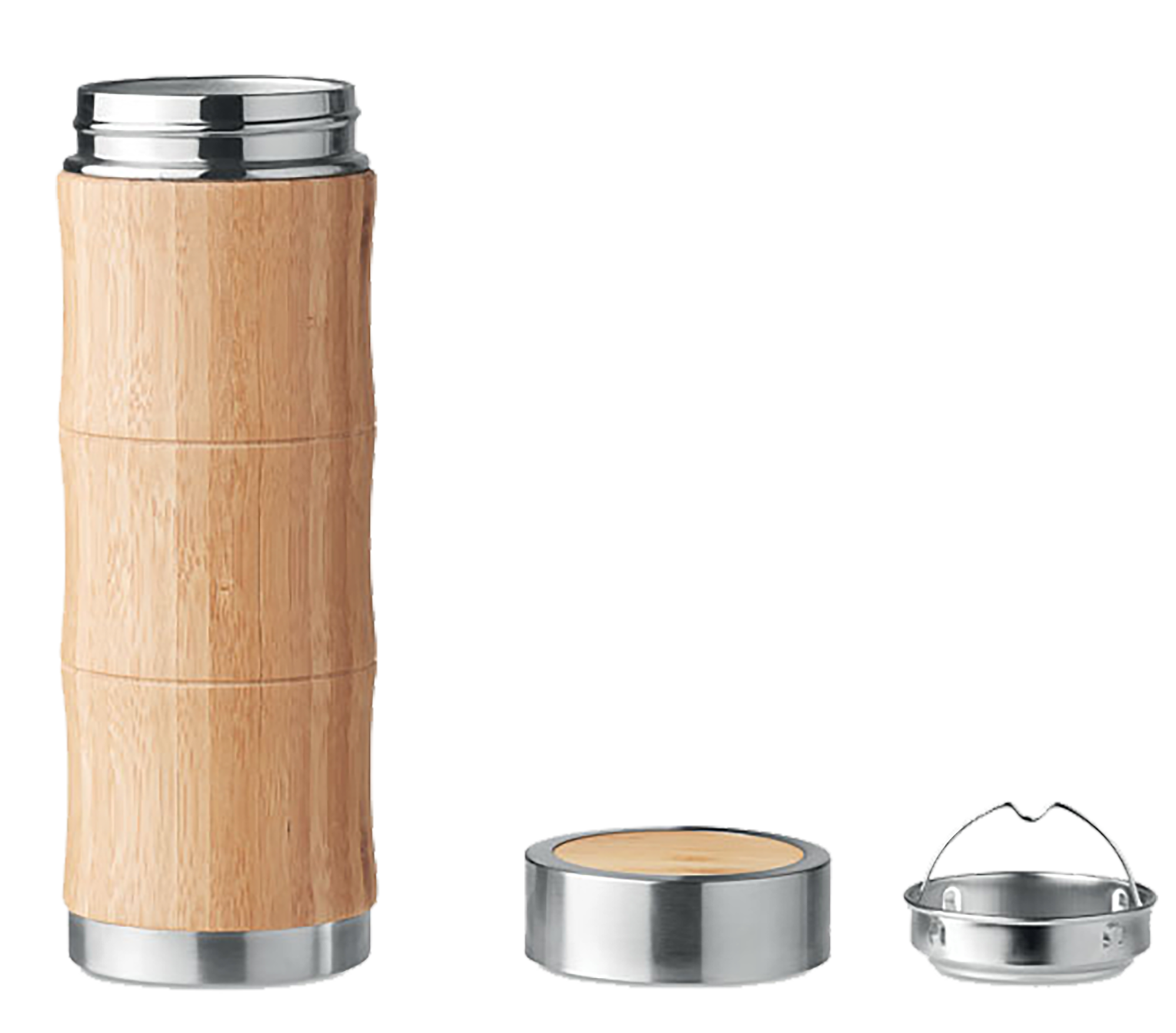 Descripción detalladaTermo de doble pared aislada al vacío de acero inoxidable con tapa de bambú e infusor de té. Capacidad: 350 ml. Antifugas.