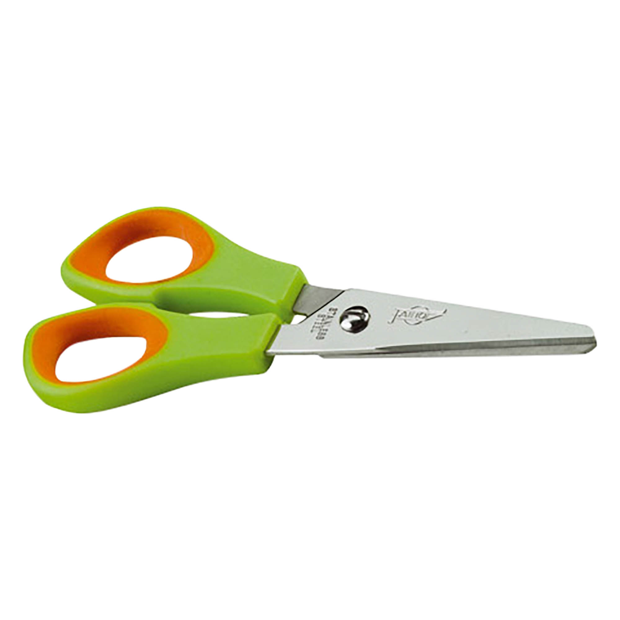 Descripción detalladaTijeras escolares de acero inoxidable, empuñadura bimateria, dúctil y suave en su parte interior. Certificadas según norma EN71-100% reciclables.
