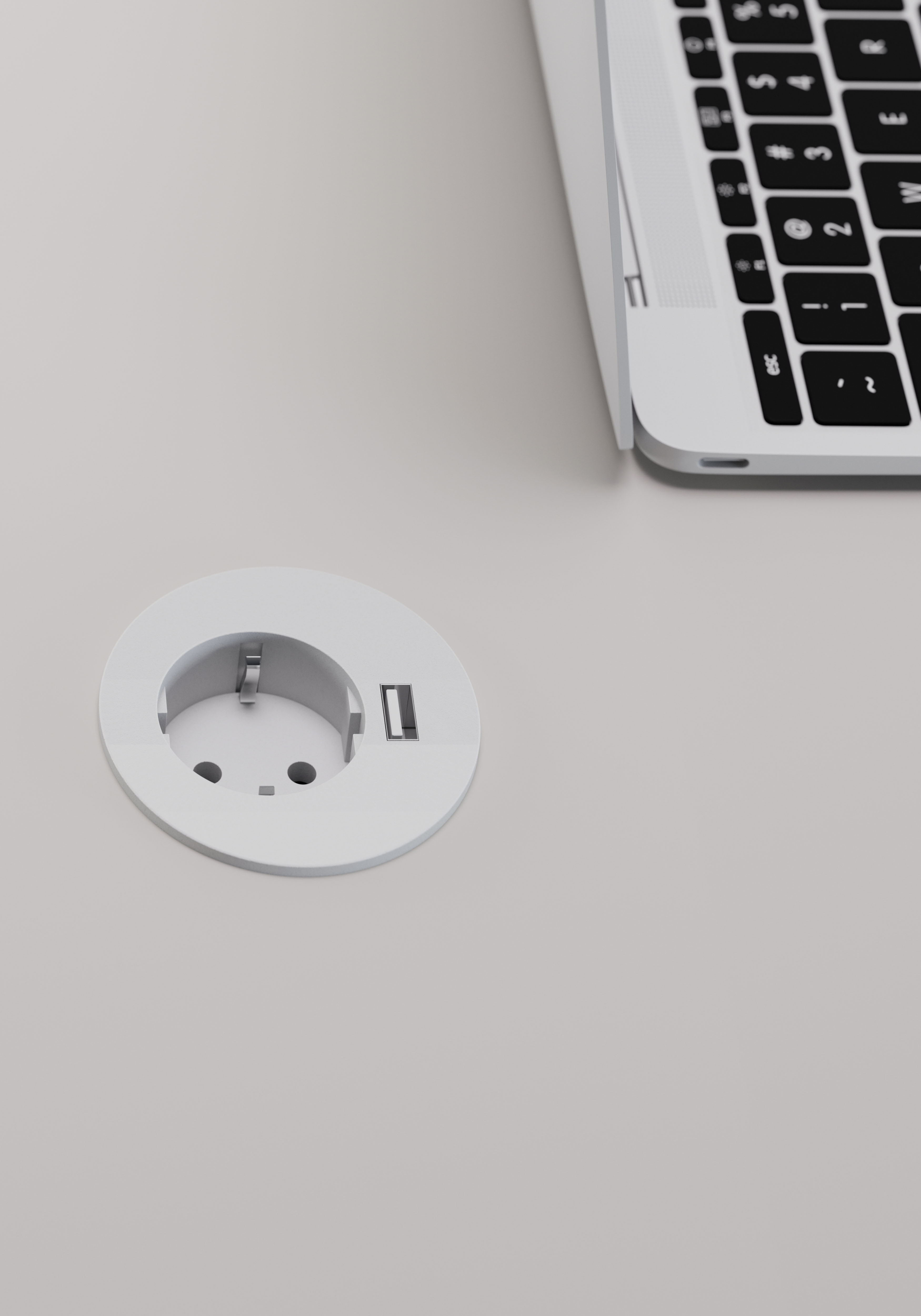Versátil y fácil de usar, esta toma de corriente y puerto USB A empotrable es adecuada para oficinas operativas y otros planos o espacios de trabajo con un pre perforado de 60 u 80 mm de diámetro.