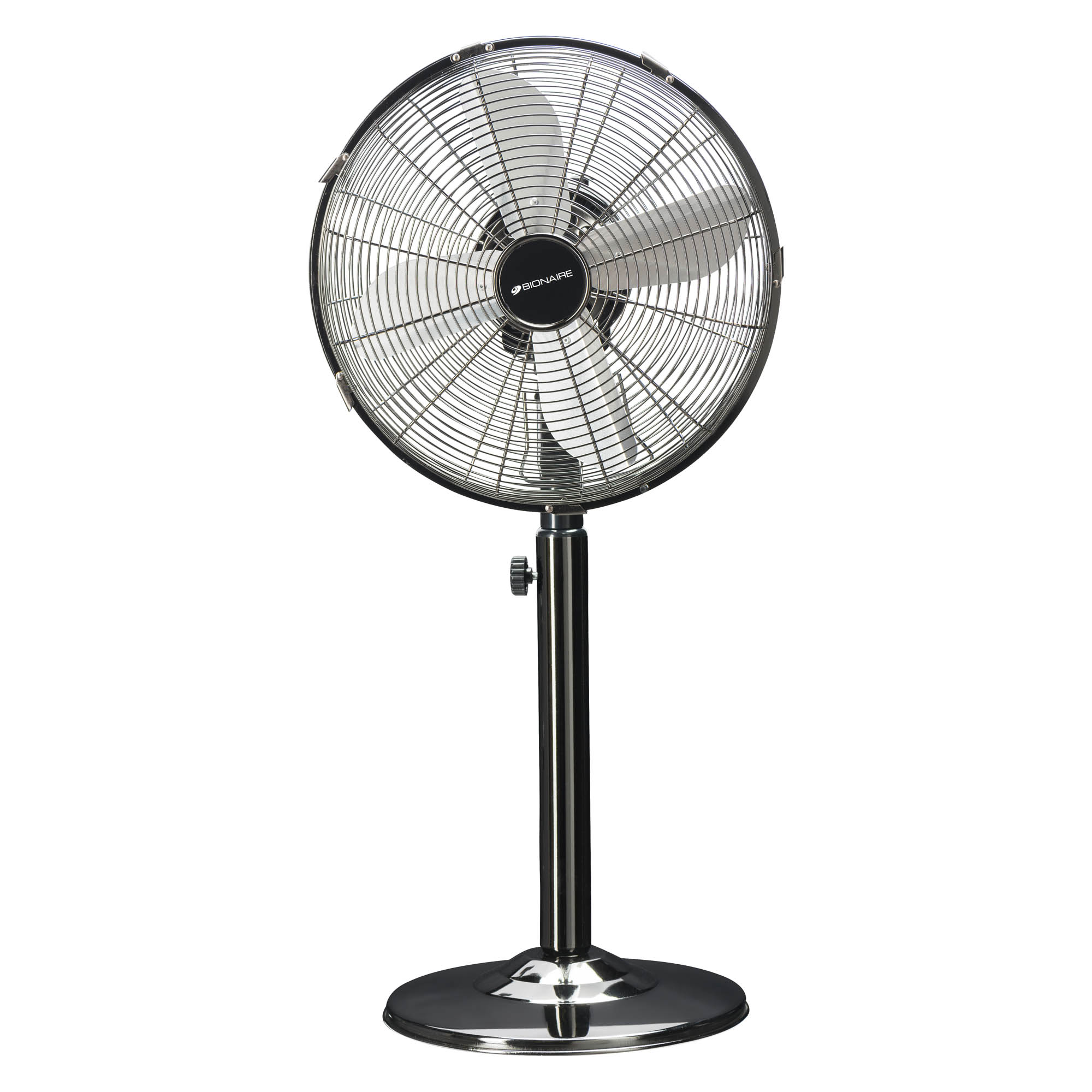Ventilador con altura regulable de 50 cm a 85 cm, permitiendo así un doble uso: de pie y de sobremesa. Aspas silenciosas de 30cm. Inclinación regulable de 90º para ajustar la dirección del aire más arriba o más abajo. Dispone de 3 velocidades para mayor o menor intensidad del aire. Fabricado en metal cromado. Dimensiones del diámetro: 36,5 cm. Peso 5kg. Cable de 1,70m de largo. Potencia: 35W. Flujo de aire: 1740m3/h.