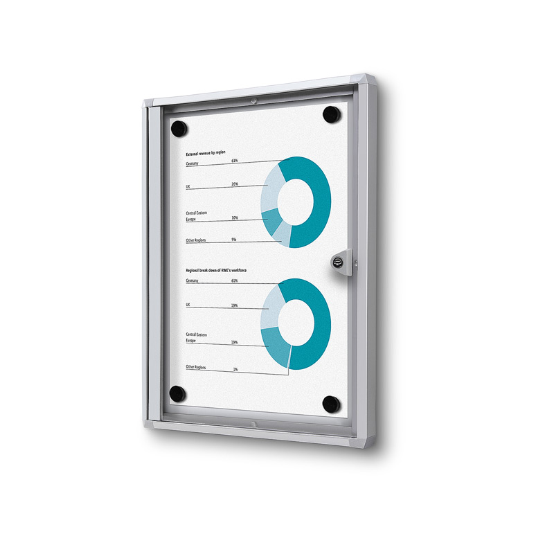 Vitrina económica para interiores, ideal para mostrar contenido. Este modelo asequible está disponible en color plata moderno o negro clásico y presenta un diseño elegante con una profundidad externa de 2,6 cm. El espacio interior para el material es de 1,2 cm, mientras que el perfil tiene un ancho de 3,1 cm. Esto la hace una opción moderna y práctica para cualquier entorno interior. Disponible con fondo de corcho o de acero magnetizable y escribible. Fija fácilmente notas y mensajes usando chinchetas o imanes. Para seguridad, el armario se puede cerrar con llave, incluyendo dos llaves por unidad, y modelos más grandes como los de 9 x A4 o 12 x A4 tienen dos cerraduras. Ofrece protección adicional contra incendios con clasificación B1 en su versión plateada con fondo de metal. Las esquinas del diseño redondeado no solo son estéticas, sino que también añaden seguridad. Esta vitrina es perfecta para oficinas, escuelas y espacios públicos, combinando costo accesible, estilo y funcionalidades prácticas.