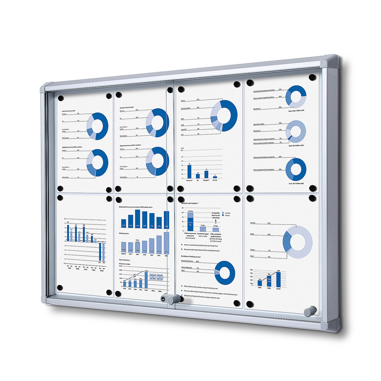 Diseño sofisticado. Los tablones interiores con puertas correderas y cerradura son ideales para exhibir anuncios importantes en espacios cerrados. Se ofrecen en diversos tamaños y su elegante diseño en color plateado complementa cualquier ambiente interior. La parte exterior tiene una profundidad de 5,9 cm, mientras que el interior ofrece 3 cm de espacio para colocar tus materiales. El perfil del marco tiene un grosor de 3 cm, garantizando la seguridad y funcionalidad del tablón. Las puertas correderas permiten un acceso sencillo, abriéndose suavemente sin obstruir, facilitando la actualización de información. Puedes utilizar imanes para sujetar documentos sobre la resistente superficie de metal trasera. El cristal de seguridad ESG de 4 mm asegura tus anuncios de manera confiable. El tablón se puede cerrar, y se incluye con dos llaves para una protección adicional de tus mensajes. Tablón seguro y resguardado. Con un enfoque en la seguridad, este tablón con puertas correderas presenta esquinas redondeadas y bordes suaves. Además, cuenta con una certificación de seguridad anti-incendios clase B1, ofreciendo tranquilidad adicional. Un tablón adecuado para oficinas, escuelas o lugares públicos. Una solución segura y con estilo para presentar tus mensajes.
