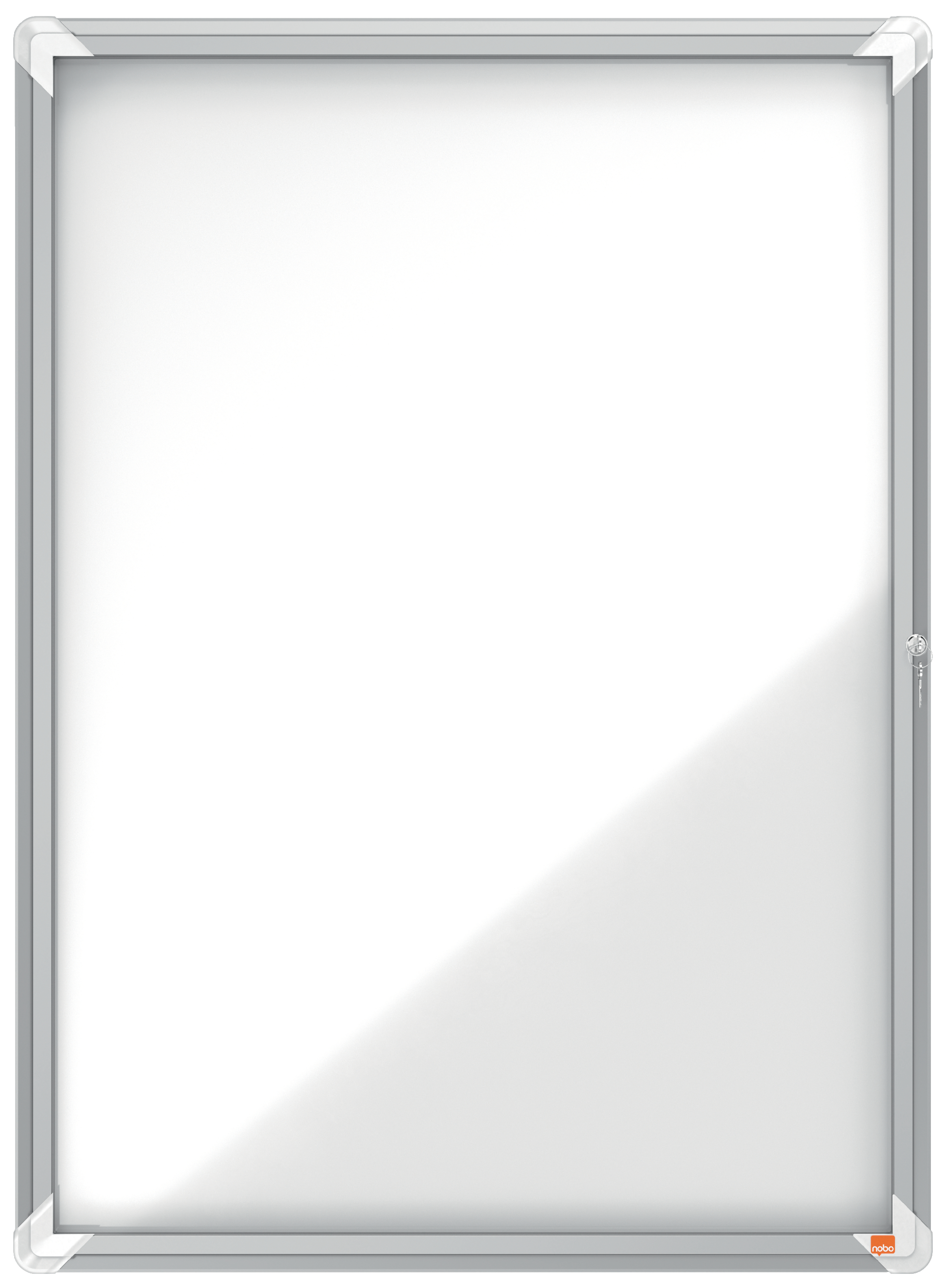 Vitrina con cerradura para interiores con superficie blanca magnética de borrado en seco y puerta de seguridad de cristal de 4 mm de grosor. Ideal para mostrar los documentos con seguridad Optimizada para diversas hojas tamaño A4 Bisagras laterales. Se suministra con los anclajes a la pared y dos llaves. Tamaño 9 × A4. Dimensiones externas: 1000 × 752 × 37 mm.