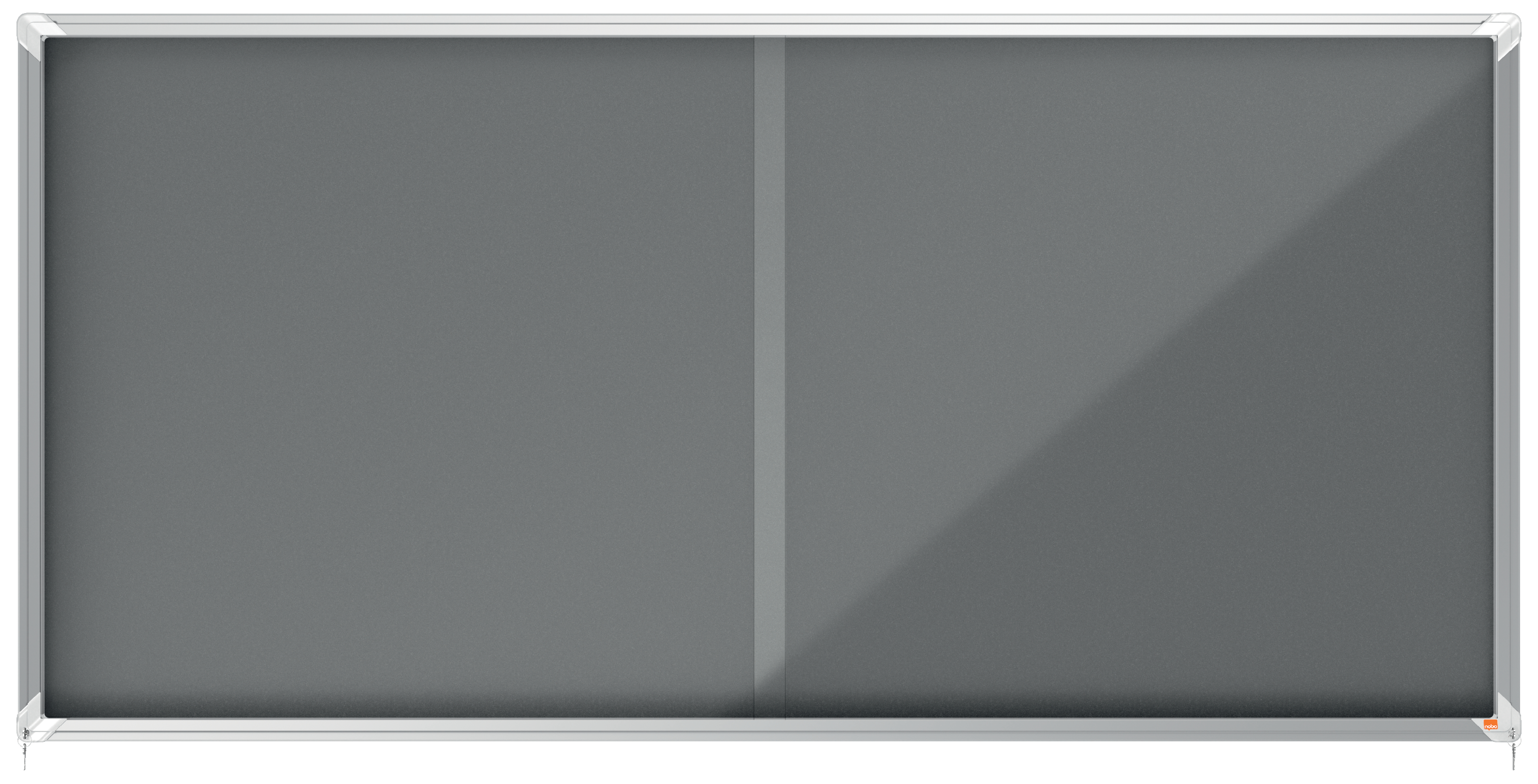 Vitrina de fieltro con puertas correderas de cristal y discreta cerradura de esquina integrada. Se completa con un moderno y elegante embellecedor de aluminio y se fija a la pared con un riel y un pasador. Excelente superficie de fieltro para fijar y exponer con seguridad tus avisos. Tamaño: 27xA4.